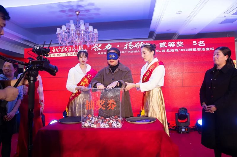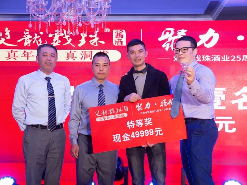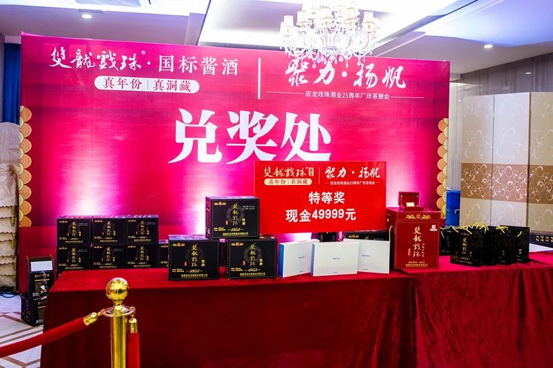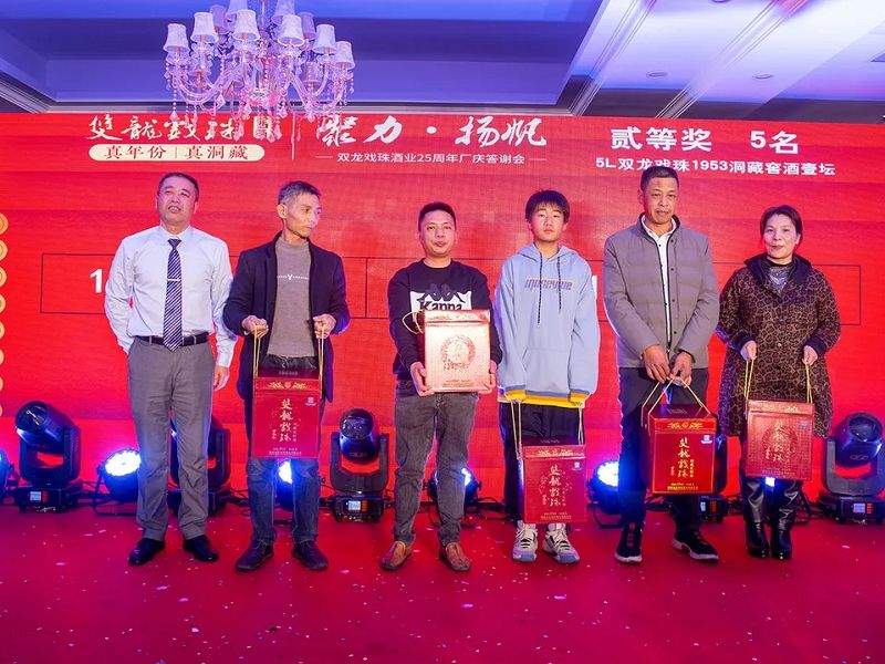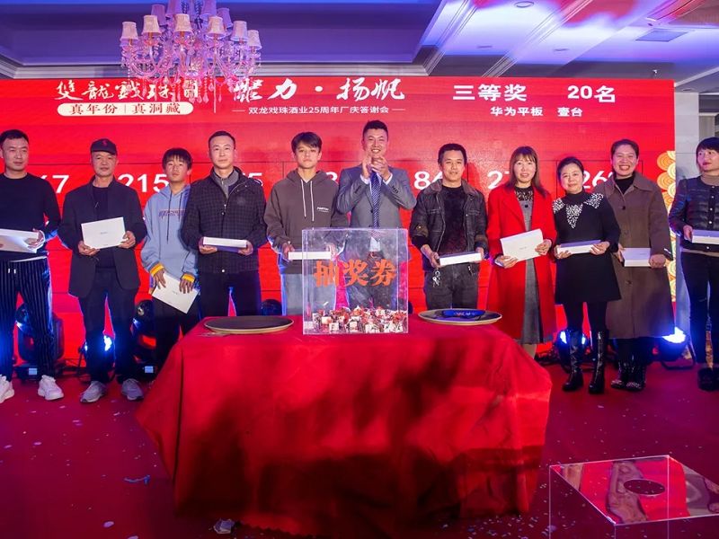 精彩的活動少不了重磅的大獎,本次雙龍戲珠酒業(yè)25周年廠慶答謝宴(政和站)設置了特等獎(49999元現(xiàn)金大獎)、一等獎(10克雙龍戲珠金條)、二等獎(5L雙龍戲珠1953洞藏窖酒)、三等獎(華為平板壹臺)、四等獎(雙龍戲珠1953窖酒248ml壹箱)、幸運獎(雙龍戲珠1953窖酒248ml貳瓶)。