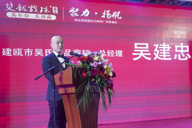 12月12日,雙龍戲珠酒業(yè)25周年廠慶答謝宴建甌站第二場暨雙龍戲珠首屆民間最牛品酒師建甌賽區(qū)半決賽在建甌市福興福大酒店隆重舉行。雙龍戲珠酒業(yè)總經理黃盛堯、建甌市吳氏兄弟食品商行總經理吳建忠出席活動并致辭。