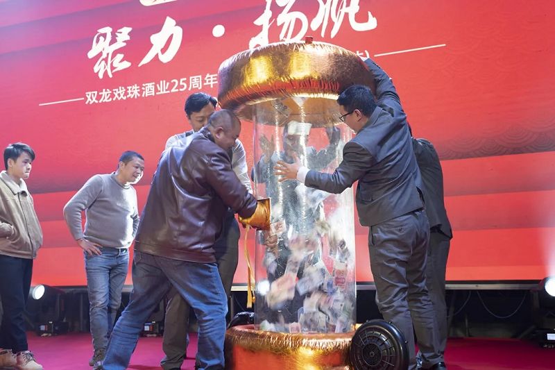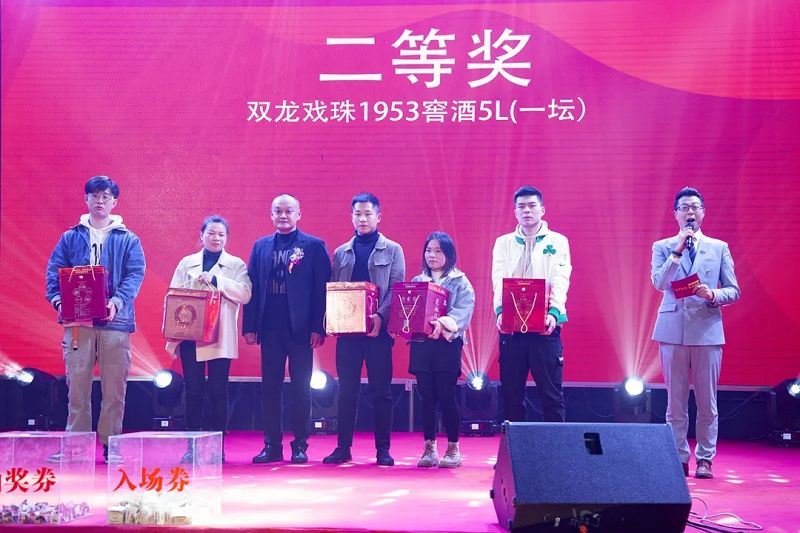 本場答謝宴共誕生特等獎(49999元現(xiàn)金)得主1位、一等獎(雙龍戲珠9999金條10克)得主3位、二等獎(5L雙龍戲珠1953洞藏窖酒)得主5位、三等獎(華為平板電腦壹臺)得主20位、四等獎(雙龍戲珠1953窖酒248ml壹箱)得主30名。