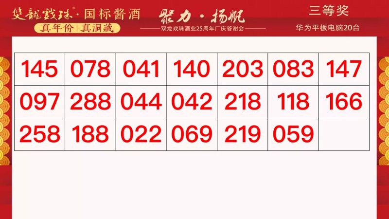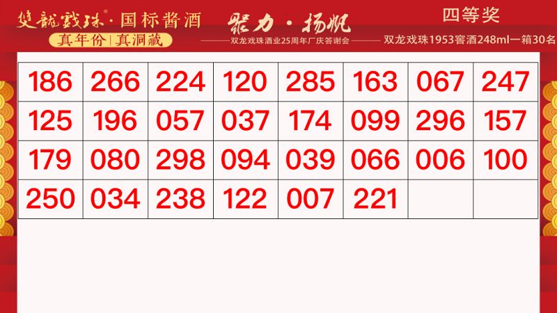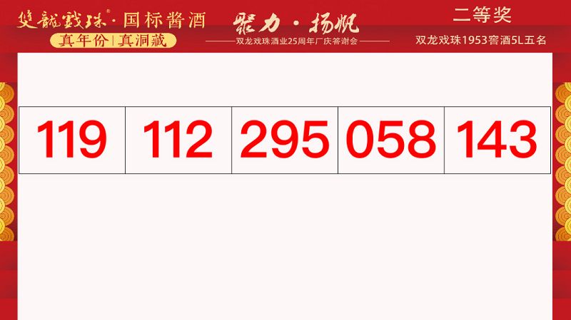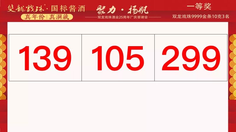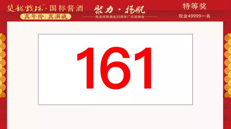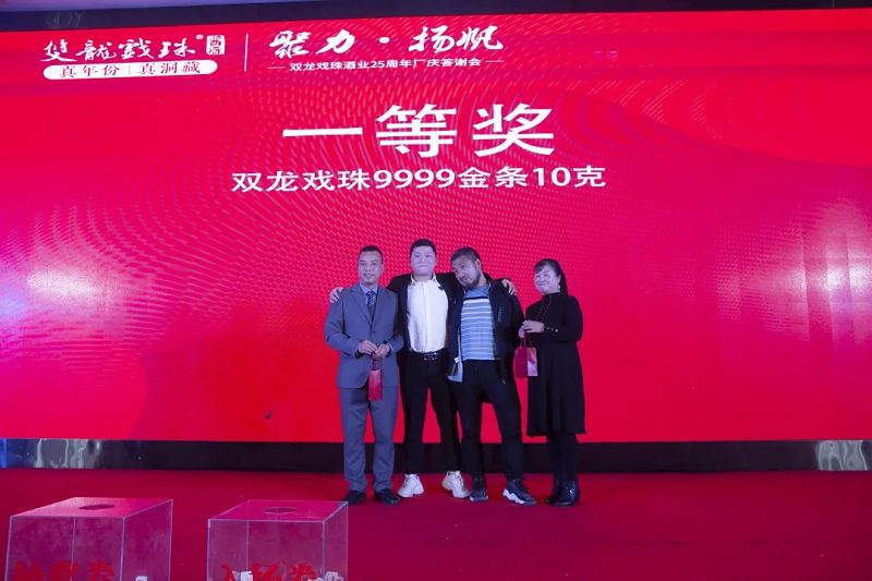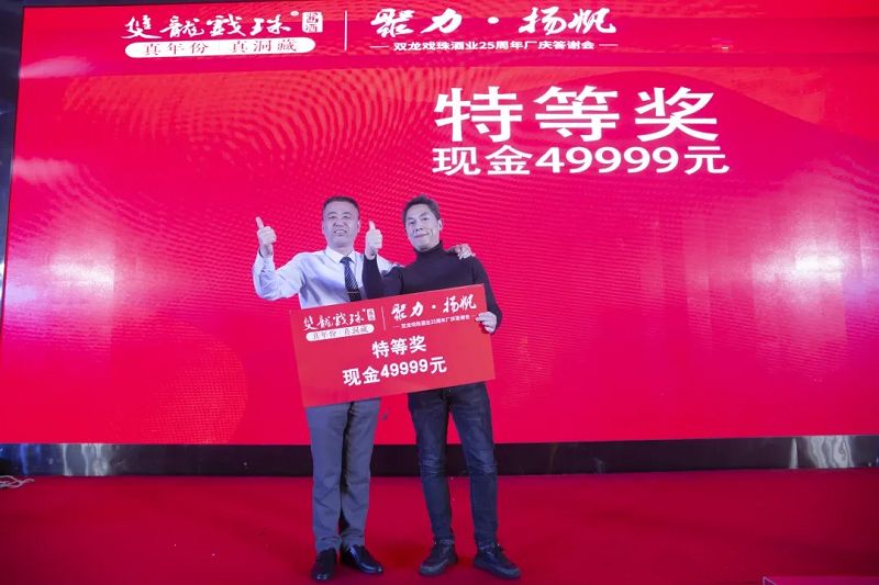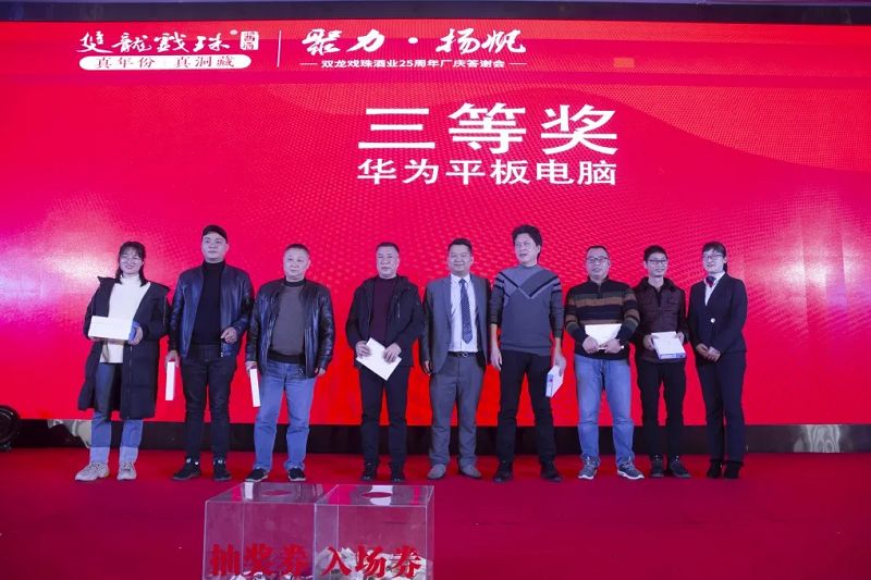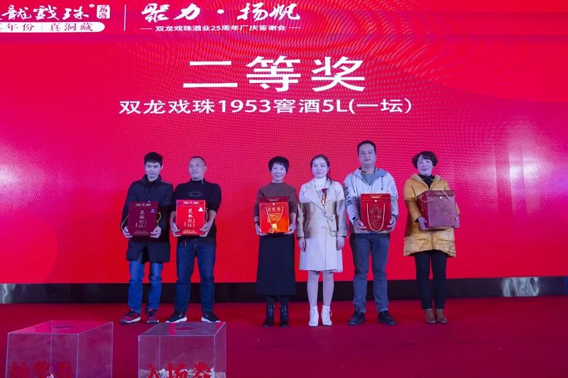 本場答謝宴共誕生特等獎(49999元現金)得主1位、一等獎(雙龍戲珠9999金條10克)得主3位、二等獎(5L雙龍戲珠1953洞藏窖酒)得主5位、三等獎(華為平板電腦壹臺)得主20位、四等獎(雙龍戲珠1953窖酒248ml壹箱)得主30名。