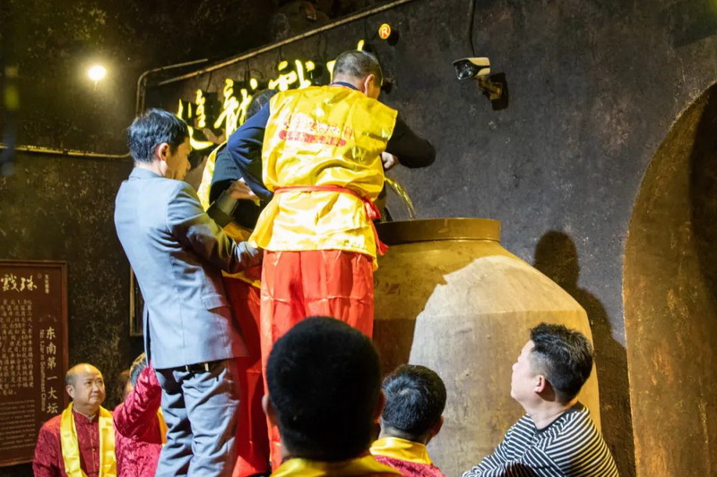 遵循雙龍戲珠的洞藏文化和入洞儀式,工作人員將第一鍋春釀酒送入雙龍洞匯入東南第一大壇進(jìn)行封壇,春釀將進(jìn)入漫長的沉淀時(shí)光,靜待歲月啟封。